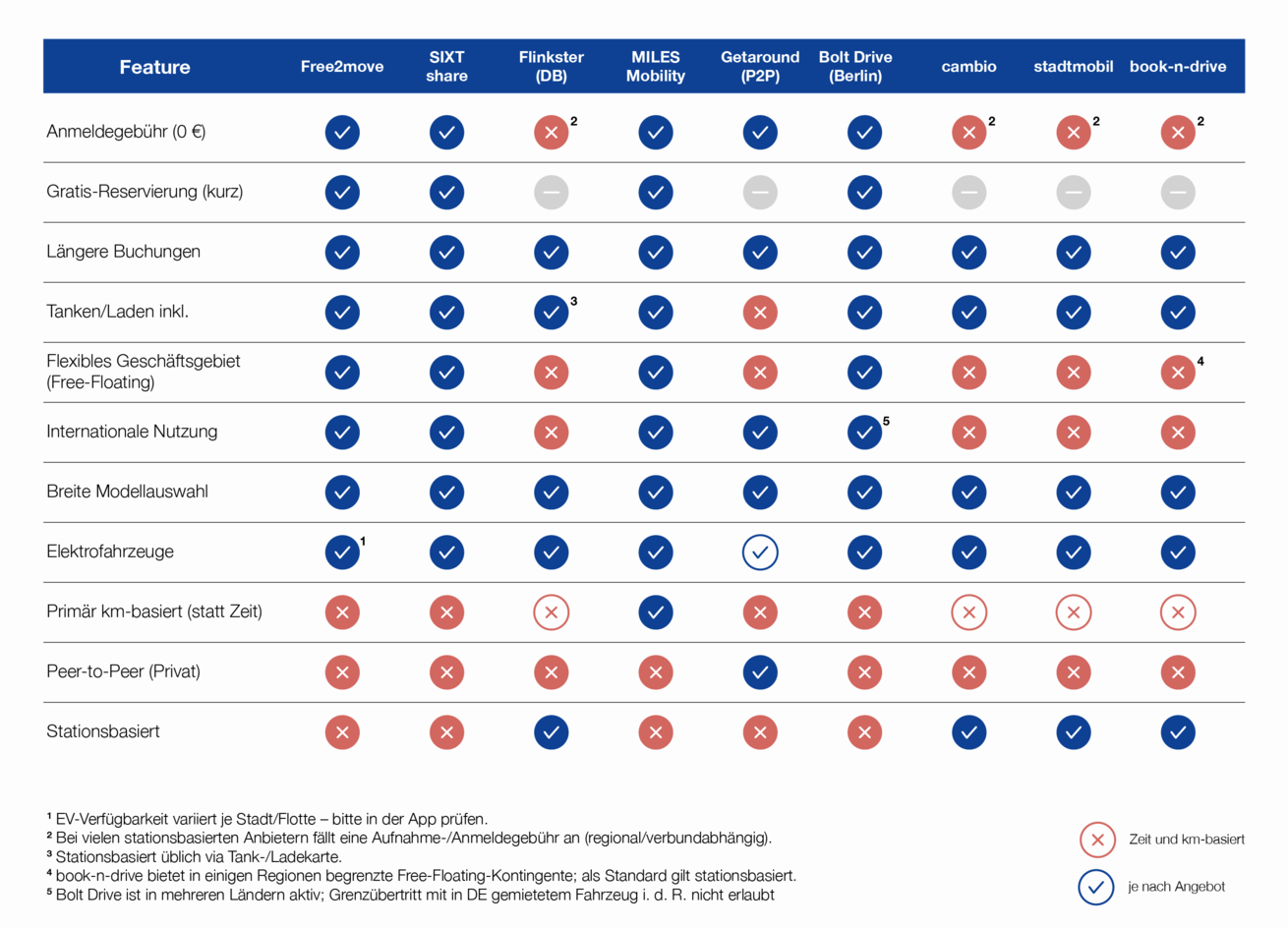 Hinweis: Die Tarife und Geschäftsgebiete ändern sich dynamisch (je nach Tageszeit, Auslastung und Saison). Für unseren Carsharing-App-Vergleich prüfen wir die Angaben in den Apps und auf den Preisseiten. Trotzdem solltest du sie vor der Buchung immer direkt in deiner App noch einmal überprüfen.