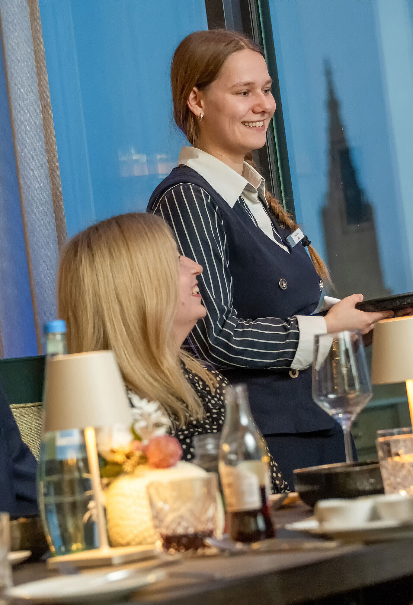 Kellner mit zwei Gläsern Roséwein auf Silbertablett im Maritim Hotel Stuttgart, freundlich und professionell