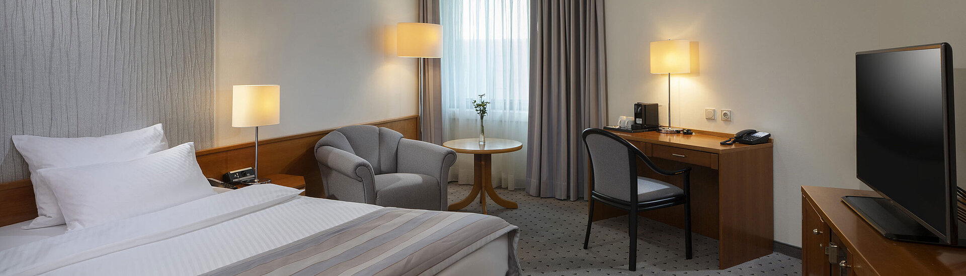 In direkter Anbindung an den Flughafen Hannover heißt Sie das elegante Maritim Airport Hotel in Hannover-Langenhagen herzlich willkommen. Durch die zentrale Lage und die unmittelbare Nähe zur Messe Hannover sowie zur Innenstadt erreichen Sie Ihre Ziele schnell und bequem mit öffentlichen Verkehrsmitteln – selbst wenn diese etwas entfernt liegen. Ganz gleich, ob Sie eine entspannte Nacht vor dem Abflug verbringen oder nach Ihrer Ankunft zur Ruhe kommen möchten: In unserem Hotel erwarten Sie moderner Komfort, herzlicher Service und das praktische Park, Sleep & Fly-Angebot für einen sorgenfreien Start in Ihre Reise. Doch auch die Stadt Hannover selbst ist einen längeren Aufenthalt wert. Erkunden Sie beliebte Sehenswürdigkeiten wie die Herrenhäuser Gärten, den Maschsee, den Erlebnis-Zoo oder das Alte und Neue Rathaus. In der Umgebung laden grüne Landschaften und ruhige Rückzugsorte zum Entdecken und Verweilen ein – perfekt für eine erholsame Auszeit vor oder nach Ihrer Reise. Zum Verweilen in Hannover laden die 527 modernen Nichtraucherzimmer und Suiten des Maritim Airport Hotel Hannover ein. Alle Zimmer sind schallisoliert und bieten Ihnen höchsten Komfort – mit Flachbildfernseher, kostenfreiem WLAN, einem Mini-Kühlschrank oder einer Minibar für erfrischende Getränke sowie einem Safe zur sicheren Aufbewahrung Ihrer Wertsachen. Für den kleinen Hunger zwischendurch erhalten Sie an der Rezeption eine Auswahl an Snacks. Zudem steht Ihnen dort ein Automat mit gekühlten Getränken rund um die Uhr zur Verfügung.