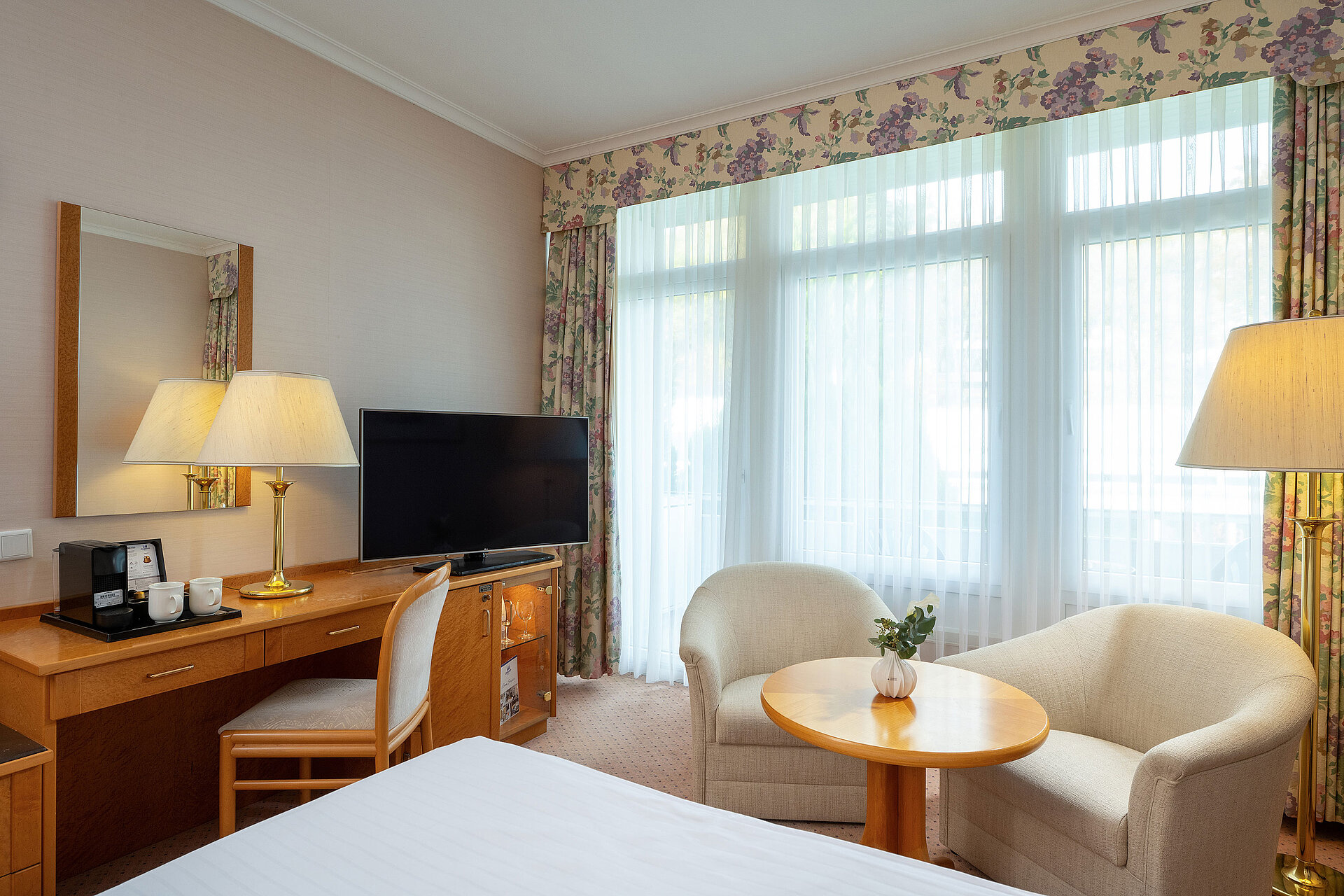 Ein Paradestück außergewöhnlicher Bäderarchitektur mitten im Grünen: das ist das Maritim Hotel Bad Wildungen. Umgeben größten Kurpark in Europa ist das Hotel ideal für alle, die nach Ruhe und Erholung suchen. Auch für einen Erkundungstrip ist das Haus günstig gelegen, denn es befindet sich fußläufig zur sehenswerten Altstadt. Weitere Ausflugsziele wie der 17 km entfernte Edersee im Landkreis Waldeck-Frankenberg, die Kleinstadt Fritzlar oder Kassel, die einzige Großstadt Nordhessens, sind schnell erreicht. Gerne stellen wir Ihnen vom Hotel aus entsprechende Ausflugspakete zusammen, auch für Gruppenreisende und Veranstaltungsteilnehmer. Tagungen, Seminare und Feiern finden gerne in der ruhigen Atmosphäre des Hotels statt und die grüne, umgebende Natur lässt kreative Ideen nur so sprudeln.